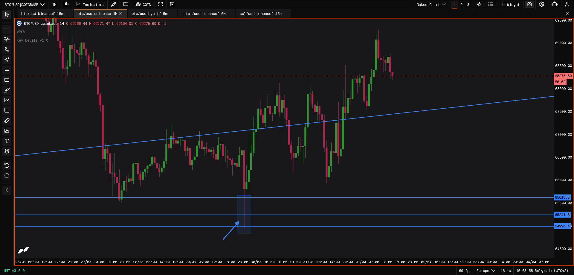 Profits taken at the next order block resistance (~67.5k), securing ~+2.5%.